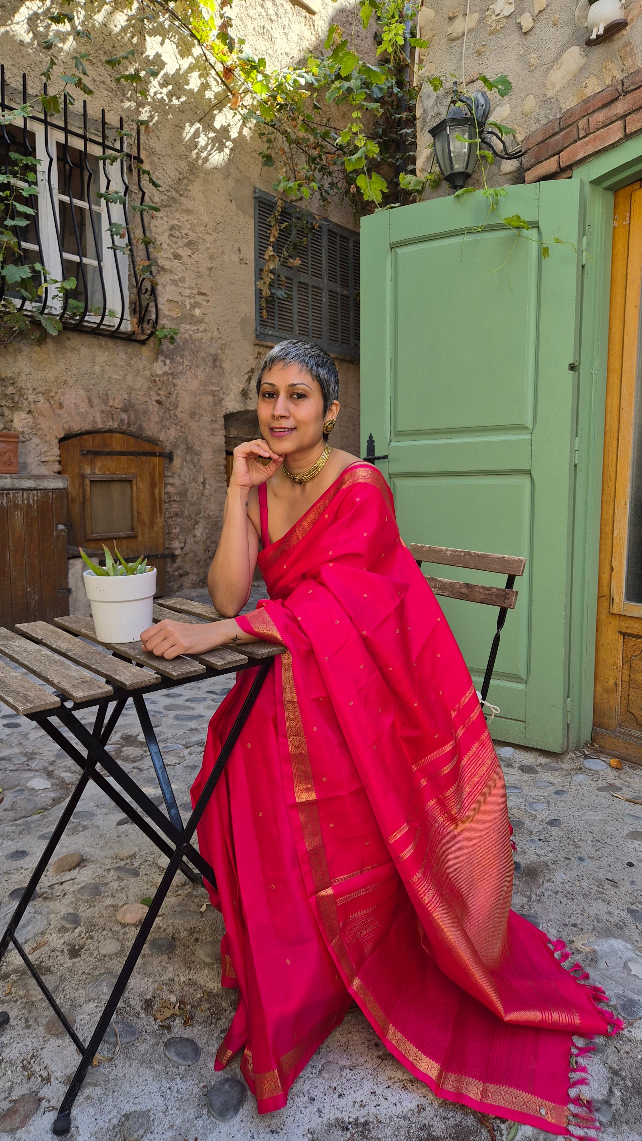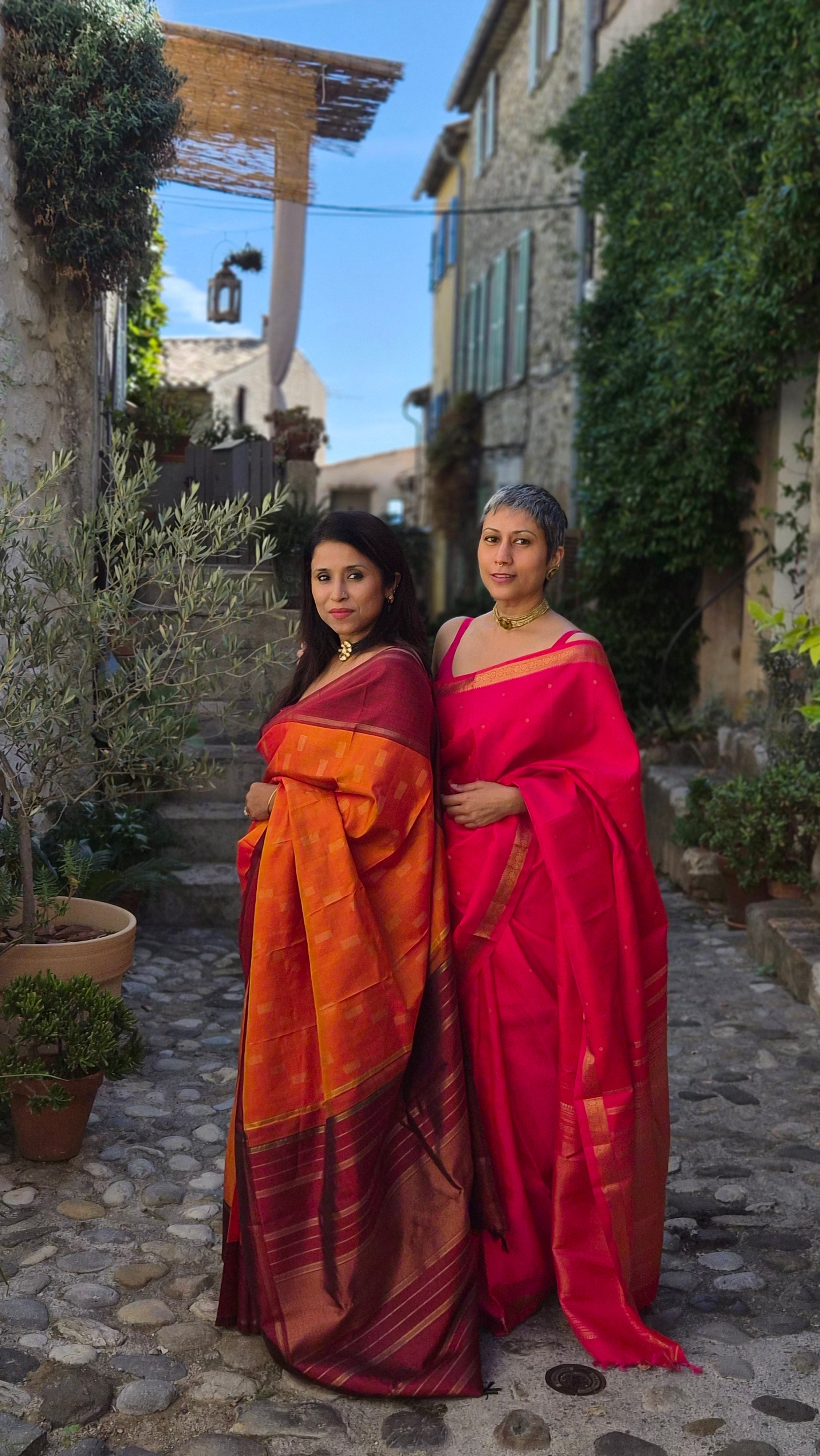 Drawn to the poetic rhythm of Southern life - from the early morning filter coffee to the serenity of temple bells and the effortless grace of silk-draped women—this brand is a personal homage. Not just to a fabric, but to a way of life. But we longed for a version that was for the modern woman who cherishes tradition but lives with a quiet confidence. At Kanchi Mori, you'll find sarees that honor centuries of craftsmanship, Pieces that nod to temple art but with clean lines, motifs that embrace tradition but whisper elegance, sarees that carry the weight of silk, without shouting for attention. Some are playful. Some are pure poetry. All are timeless.