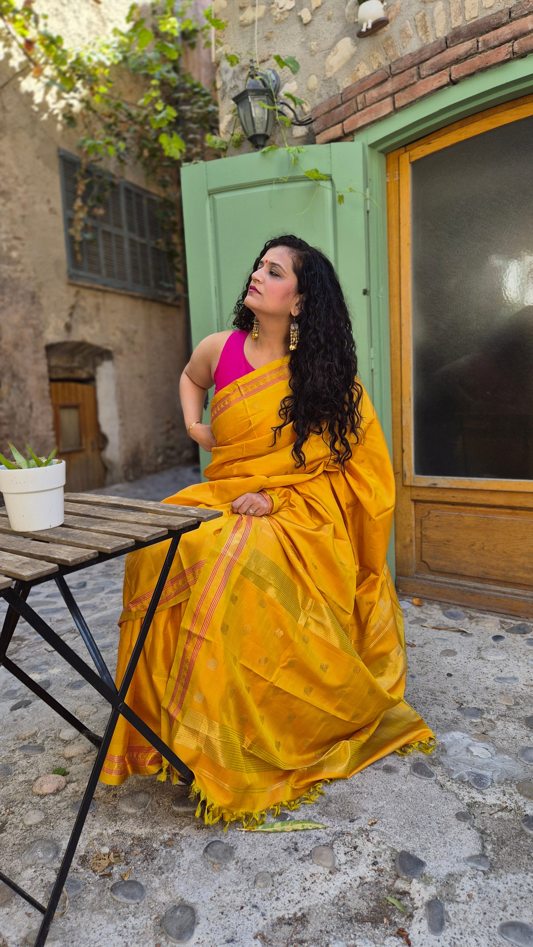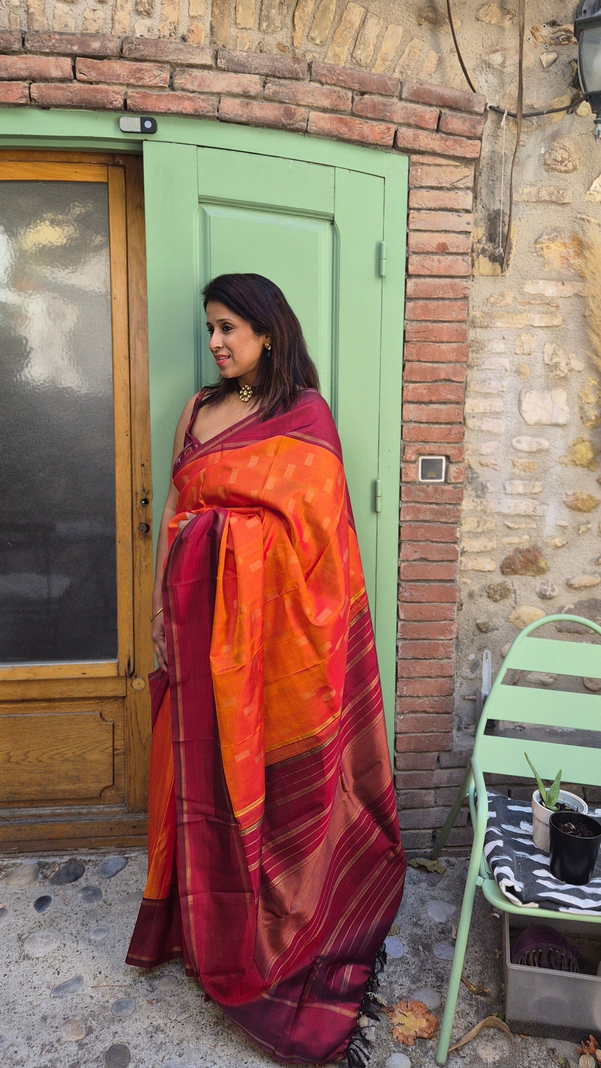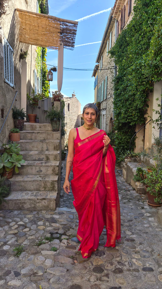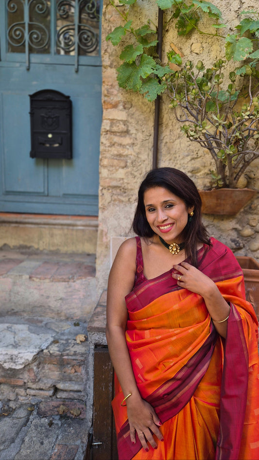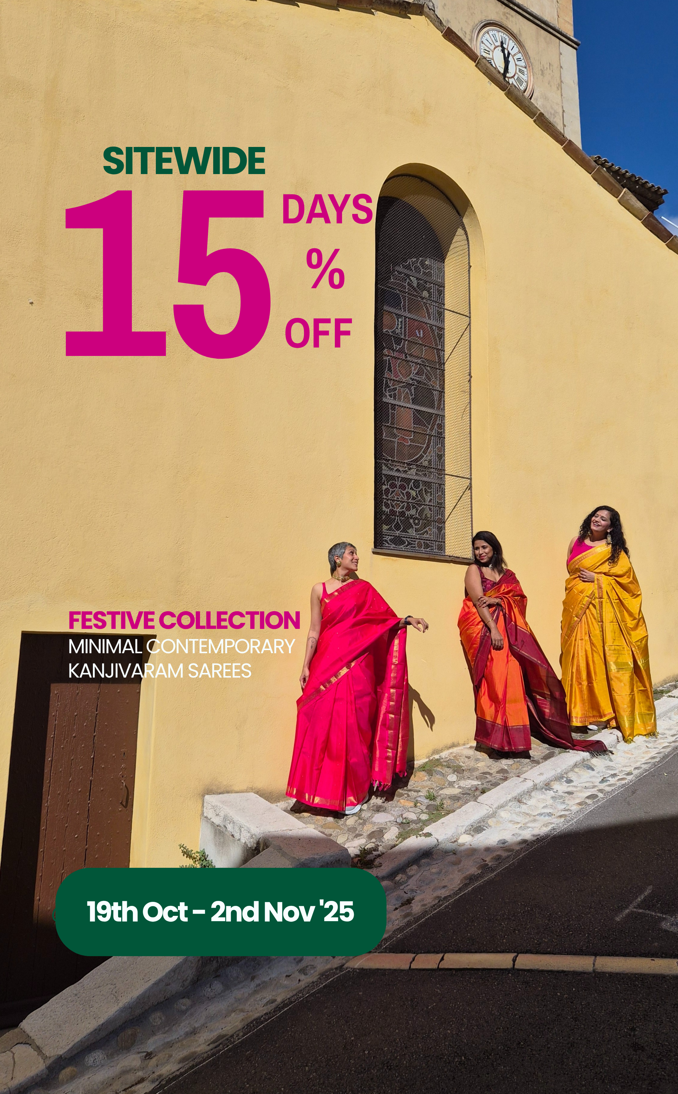 Drawn to the poetic rhythm of Southern life - from the early morning filter coffee to the serenity of temple bells and the effortless grace of silk-draped women—this brand is a personal homage. Not just to a fabric, but to a way of life. But we longed for a version that was for the modern woman who cherishes tradition but lives with a quiet confidence. At Kanchi Mori, you'll find sarees that honor centuries of craftsmanship, Pieces that nod to temple art but with clean lines, motifs that embrace tradition but whisper elegance, sarees that carry the weight of silk, without shouting for attention. Some are playful. Some are pure poetry. All are timeless.